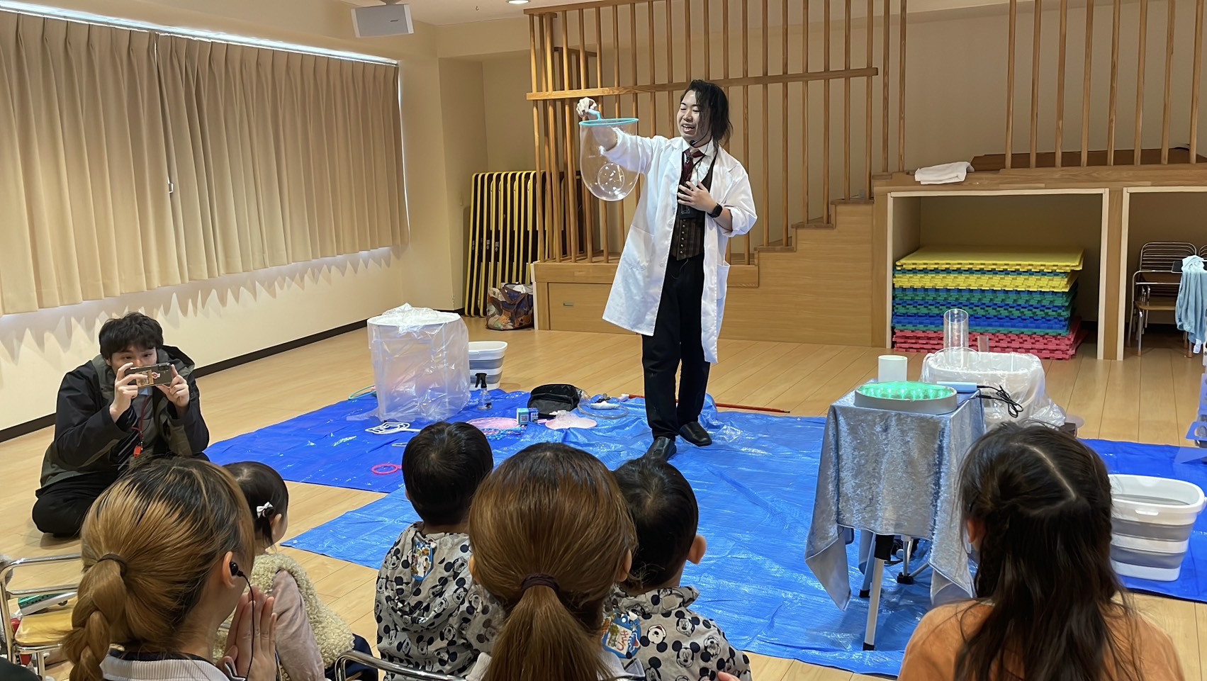 白衣姿のふたりが、子どもたちの前で シャボン玉や科学を使って、まるで魔法のようなショーを繰り広げます。