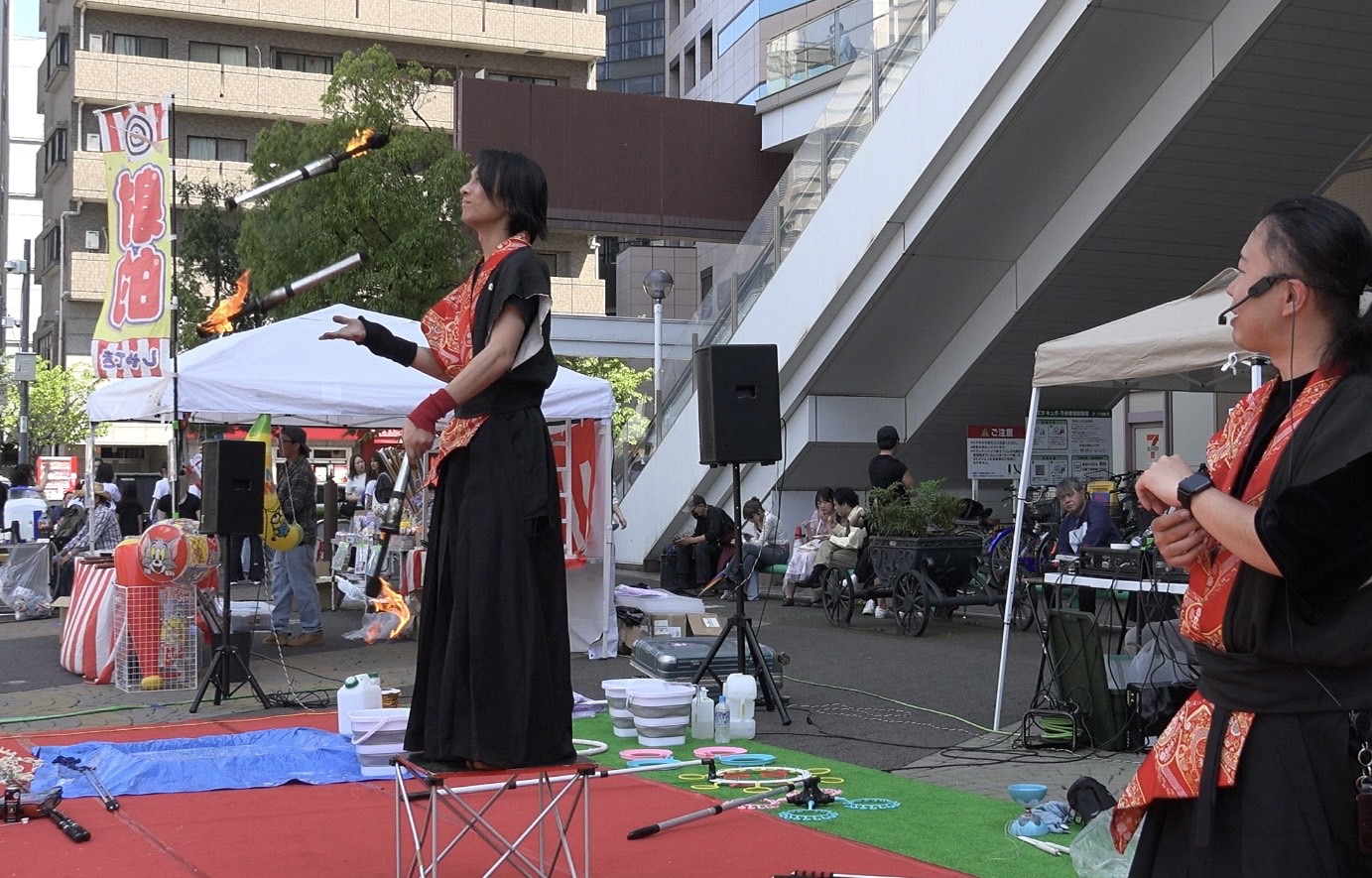 約5分間の本編に対し、20分以上を使って空間を作り上げる大道芸ならではの構成で、短時間ながらも強いインパクトを残すショーとなりました。